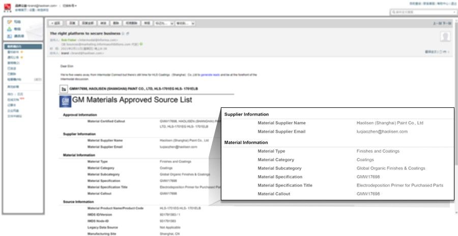 郵件中只有一份簡單的報告,報告顯示:由浩力森研發(fā)的HLS-17系列陰極電泳漆,通過通用汽車公司(GM)“Global Organic Finishes & Coatings”(全球有機飾面和涂料)認(rèn)證,并被列入 “GM Materials Approved Source List”(通用汽車材料準(zhǔn)許來源清單),這意味著HLS-17系列產(chǎn)品可用于通用汽車全球所有汽車零部件產(chǎn)品。
