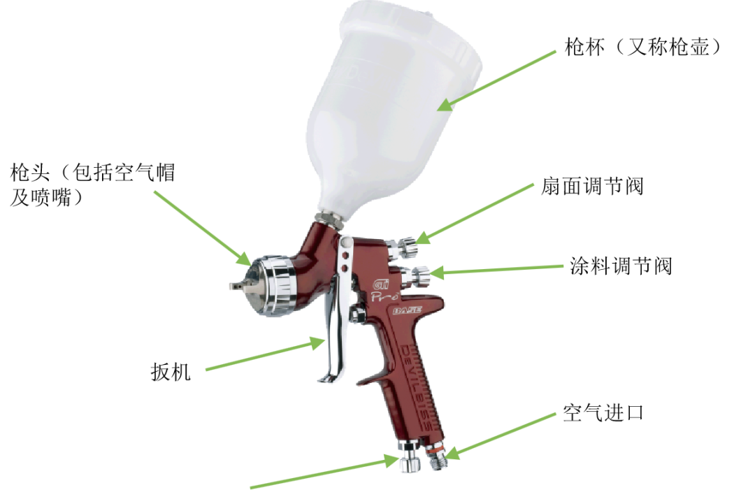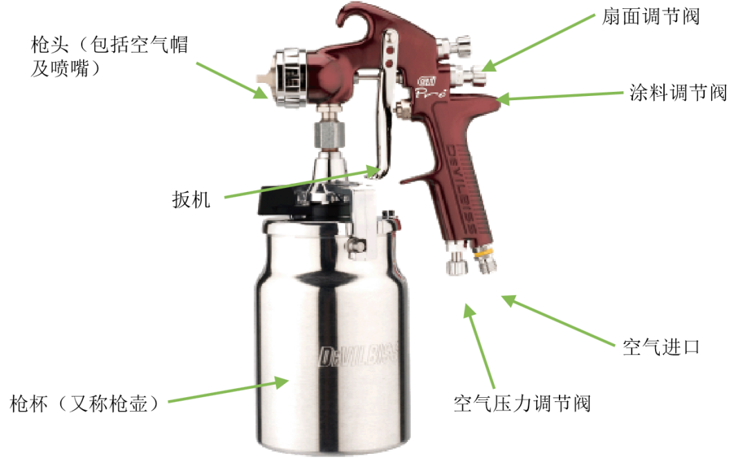 上圖為重力式空氣噴槍,其涂料罐位于噴槍的上部,涂料靠自身的重力與涂料噴嘴前端形成的負壓作用從涂料噴嘴噴出,并與空氣混合霧化。通常用于小面積修補或涂料用量少與換色頻繁的噴涂作業(yè)場合。