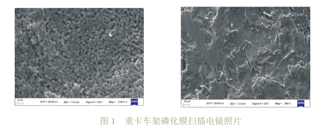 磷化膜的功能是提高涂覆在其上的電泳漆膜的附著力和耐蝕性,磷化膜結(jié)晶要求均勻致密,尺寸<8μm,進(jìn)一步分析磷化是否對(duì)電泳漆膜表面粗糙產(chǎn)生不良影響。采用車架縱梁沖孔邊角料在車架現(xiàn)場隨線制備了磷化膜,對(duì)磷化膜進(jìn)行掃描電鏡SEM分析。掃描電鏡圖片如圖1所示,發(fā)現(xiàn)磷化膜為粒狀,結(jié)晶均勻致密,結(jié)晶尺寸2~3μm,成膜質(zhì)量合格,均符合標(biāo)準(zhǔn)要求,未發(fā)生異常波動(dòng),故磷化膜質(zhì)量不是車架電泳漆膜粗糙的主要原因。