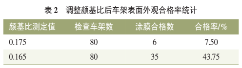 電泳涂裝的顏基比指電泳漆、槽液或漆膜中的顏料與基料(樹脂)之比,電泳槽液和新配的電泳原漆槽液顏基比應(yīng)是相同的,但在電泳過程中,顏料和樹脂不定按照原配比沉積到被涂物上,因而產(chǎn)生槽液、漆膜和原漆三者的顏基比不相同的現(xiàn)象,電泳槽液顏基比失調(diào)易產(chǎn)生縮孔粗糙、失光等漆膜弊病,影響漆膜性能,因此需要定期檢測槽液顏基比,按檢測結(jié)果添加乳液或色漿調(diào)整槽液的顏基比。電泳槽液顏基比技術(shù)要求在0.14~0.20范圍內(nèi),按照Q/JQ11219.4《涂料灰分、顏基比測定方法》進(jìn)行檢測,顏基比雖在工藝要求范圍內(nèi),但是在明顯升高,通過調(diào)整顏基比范圍,使其降低至0.165左右,發(fā)現(xiàn)車架外觀糙合格率由7.5%提升至43.75%(見表2),故顏基比失調(diào)為電泳漆膜外觀的主要影響因素。