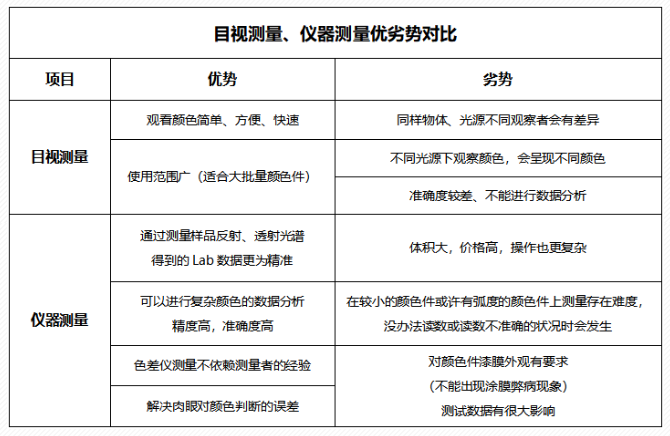 對顏色的判定一般有兩種方式,一種是目視,另一種是通過儀器測量,這兩種方法都是最為常見的測試方法,也有著不一樣的優(yōu)勢與劣勢。