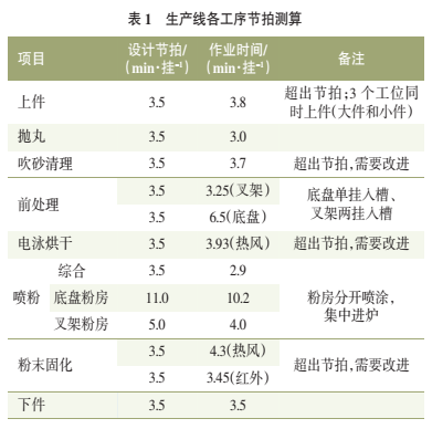 整改措施:1)針對(duì)換粉發(fā)現(xiàn)的影響節(jié)拍問(wèn)題,通過(guò)與技術(shù)工藝人員現(xiàn)場(chǎng)試驗(yàn)并分析,結(jié)合噴粉供粉系統(tǒng)及輸送特點(diǎn),指定了可視化的換粉操作步驟,同時(shí)形成標(biāo)準(zhǔn)作業(yè),對(duì)員工進(jìn)行培訓(xùn),減少了因換粉導(dǎo)致的節(jié)拍浪費(fèi),由原來(lái)1.5 h降低到目前的0.5h。2)由于在換粉過(guò)程中,此粉房屬于停線狀態(tài),因生產(chǎn)線為大小兩個(gè)粉房,通過(guò)對(duì)每個(gè)粉房的操作節(jié)拍進(jìn)行測(cè)算兩個(gè)粉房的生節(jié)拍分別為10.5 min/掛、4.0min掛,為保證整體節(jié)拍滿足3.5min,可通過(guò)排產(chǎn)時(shí)將上線計(jì)劃進(jìn)行調(diào)整,將特殊顏色產(chǎn)品單獨(dú)進(jìn)一個(gè)粉房,在特殊顏色中間穿插6掛正常顏色,在特殊顏色進(jìn)行換色時(shí),將特殊顏色工件倒入換粉粉房前貯存區(qū),給后續(xù)正常顏色工件騰出輸送路線,數(shù)量根據(jù)粉房前貯存區(qū)大小確定,這樣可實(shí)現(xiàn)正常顏色在換粉的0.5 h內(nèi)繼續(xù)轉(zhuǎn)移至另外一個(gè)粉房,實(shí)現(xiàn)粉房的正常運(yùn)行,從而保證整體節(jié)拍依然能夠滿足整體產(chǎn)線節(jié)拍要求。