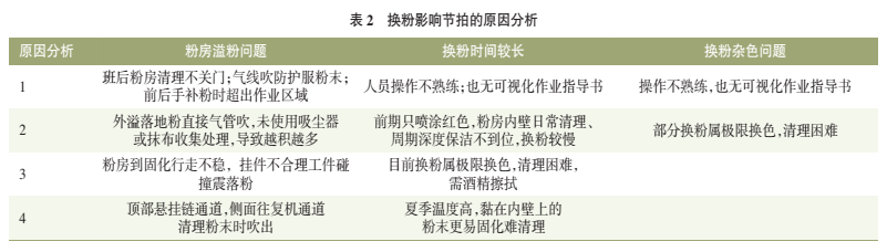 現(xiàn)狀分析:噴粉工位在測(cè)算標(biāo)準(zhǔn)作業(yè)時(shí)間時(shí),主要在換粉時(shí)超出作業(yè)時(shí)間,因噴粉工位為大小兩個(gè)噴粉室,在顏色更換時(shí)需要對(duì)集中供粉及噴粉室內(nèi)部進(jìn)行清理,同時(shí)噴粉室周邊有少量溢粉,定期清理耽誤節(jié)拍時(shí)間,具體原因分析見表2。
