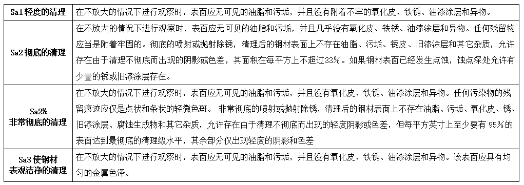 重要涂裝面除銹等級:≥Sa2.5(A面);一般涂裝面除銹等級:≥Sa2(B面、C面);被噴涂表面無灰塵、油及其它雜質(zhì)。標(biāo)準(zhǔn)參考ISO-8501-1。達(dá)到Sa 2-2.5級;密度85%以上;表面粗糙度在25-40um之間;在不使用放大鏡的情況下觀察出來的任一個經(jīng)過近出白金屬噴砂清理的表面,應(yīng)無任何可見的油漬、油脂、灰塵、污垢、氧化皮、鐵銹、膜層、氧化物、腐蝕物,以及其它外來物質(zhì)。