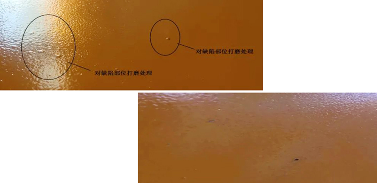 1.2 在噴漆房或者流平間濕膜狀態(tài)下。發(fā)現(xiàn)缺陷流掛或者漏噴——利用毛刷或者滾筒刷涂及滾涂,根據(jù)缺陷情況清洗毛刷及蘸涂料進行操作,目測平整為止,在經(jīng)過流平后無明顯痕跡和缺陷。
