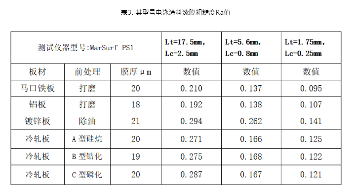 電泳涂料在不同金屬基材上電泳沉積形成電泳漆膜,受到板材基材粗糙度影響、前處理皮膜粗糙度影響,以及在不同基材和前處理皮膜上導電特性差異導致的電沉積差異性、以及電泳涂料自身的流平特性差異,最終的電泳漆膜會測的不同的粗糙度Ra,其數(shù)據(jù)展示如下: