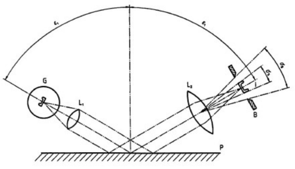 光澤度儀器的原理,是用一個(gè)光源和一個(gè)接收器,來(lái)測(cè)量材料表面的反射光通量的大小。如果儀器調(diào)校以后,環(huán)境溫度有變化,導(dǎo)致光源的發(fā)光效率變化,那么光源發(fā)光效率變化的誤差就會(huì)直接體現(xiàn)在測(cè)量數(shù)據(jù)中。如果有溫度補(bǔ)償功能,那么溫度變化引起的發(fā)光效率變化,能夠得到補(bǔ)償,保證光源的發(fā)光效率不變。光澤度計(jì)的測(cè)量原理如圖《測(cè)量原理》所示。儀器的測(cè)量頭由發(fā)射器和接受器組成,發(fā)射器由白熾光源和一組透鏡組成,它產(chǎn)生一定要求的入射光束。接受器由透鏡和光敏元件組成,用于接受從樣品表面反射回來(lái)的錐體光束。