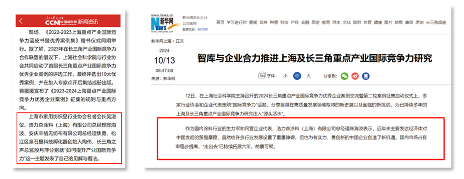 近日,浩力森受邀參加了由上海市商務(wù)委員會支持、上海社會科學(xué)院主辦的2024長三角重點(diǎn)產(chǎn)業(yè)國際競爭力優(yōu)秀企業(yè)案例交流暨第二輪案例征集啟動(dòng)儀式。 . 據(jù)悉,2023年,在長三角產(chǎn)業(yè)國際競爭力合作聯(lián)盟的倡議下,上海社會科學(xué)院與行業(yè)協(xié)會共同評選出了首屆長三角重點(diǎn)產(chǎn)業(yè)國際競爭力優(yōu)秀企業(yè)案例,共有10大案例脫穎而出,并在加入專家點(diǎn)評后集結(jié)成書。同時(shí),會上還公布了《2023-2024上海重點(diǎn)產(chǎn)業(yè)國際競爭力優(yōu)秀企業(yè)案例》的征集規(guī)則與重點(diǎn)方向。 人民日報(bào) / 新華網(wǎng) 此次會議吸引了包括人民日報(bào)、新華網(wǎng)、文匯報(bào)、解放日報(bào)在內(nèi)的眾多國家級主流媒體的高度關(guān)注與廣泛報(bào)道。 作為國內(nèi)涂料行業(yè)的生力軍和民營企業(yè)代表,浩力森的代表在會上衷心感謝上海化工行業(yè)協(xié)會的活動(dòng)邀請,并進(jìn)一步指出,近年來,主要發(fā)達(dá)經(jīng)濟(jì)體對中國發(fā)起的貿(mào)易摩擦確實(shí)給行業(yè)發(fā)展帶來了不少挑戰(zhàn),但同時(shí)也為那些有實(shí)力、勇于創(chuàng)新的中國企業(yè)帶來了新的機(jī)遇。 . 浩力森憑借自身的實(shí)力和創(chuàng)新精神,在國內(nèi)市場的占有率穩(wěn)步提高,同時(shí),“走出去”戰(zhàn)略也已持續(xù)實(shí)施了六年,前景十分廣闊。