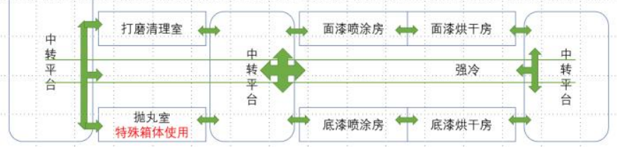 1. 碳鋼厚板件:自動(dòng)拋丸→清理→富鋅漆自動(dòng)噴涂(8-15μm 做短期防銹)→烘烤(設(shè)定 80℃) →冷卻→下件; (與集裝箱前處理工藝及性質(zhì)相同)
